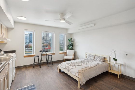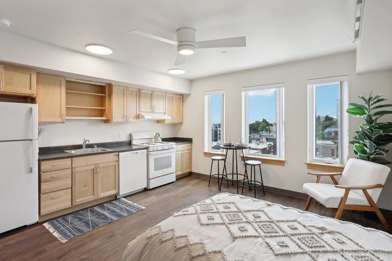 Pride Place offers affordable housing for adults ages 55 and older in Seattle's Capitol Hill neighborhood. The community provides studio and one-bedroom apartment homes designed with spacious, open layouts to maximize natural light. Each unit is equipped with a ceiling fan and a full-sized dishwasher. Select units may be available with limited time offers and restrictions may apply.